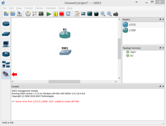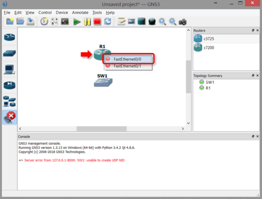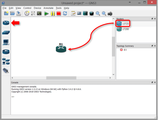 - In your GNS3 project file, click the router icon on the left, select the model of your choice (I’m going to go with the c3725 here), and drag it out into your topology. It will start up as a router, i.e. R1. Your screen layout may vary slightly from mine — but you’ll get the idea.