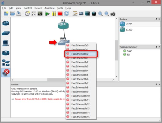- Click your switch and select an interface. For the sake of accuracy, using the interfaces which start with the number 1 are in your etherswitch module, so I’m going with FastEthernet1/0.