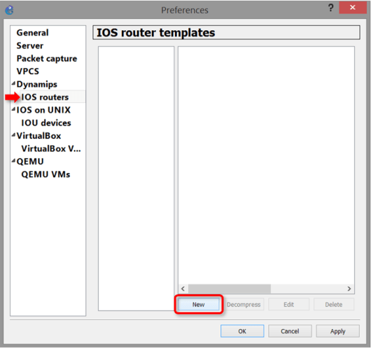 - Under the menu entry for Dynamips, click on IOS routers and then click the New button.
