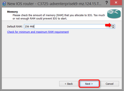 - For the Memory screen, bump the Default RAM setting up to at least 256MiB, then click Next. This is necessary to get Spanning Tree Protocol to work properly in server/client mode later down the line.