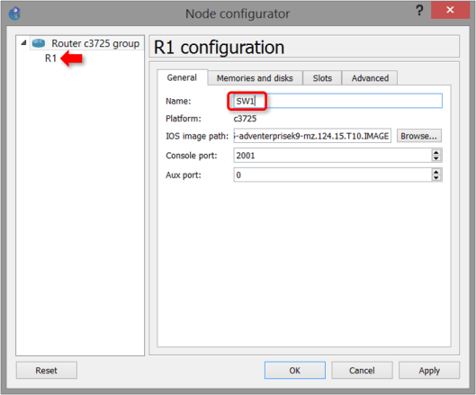 - In the Node configurator screen, click on your device to open the device configuration screen (shown here as R1 configuration). Go ahead and change the name of the device to something…switch-like. I went with the classic SW1 here but feel free to use your imagination, as long as it’s something that reminds you that you’re dealing with a (soon to be) Layer 2 device.