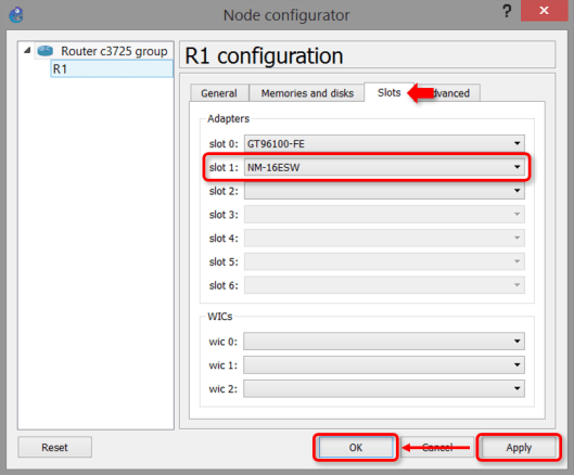 - Click the Slots tab. Under Adapters, click the drop-down box next to slot 1 and select NM-16ESW. This module adds 16 FastEthernet switchports to your router. Click Apply, then Okay to close out of the configuration screen.