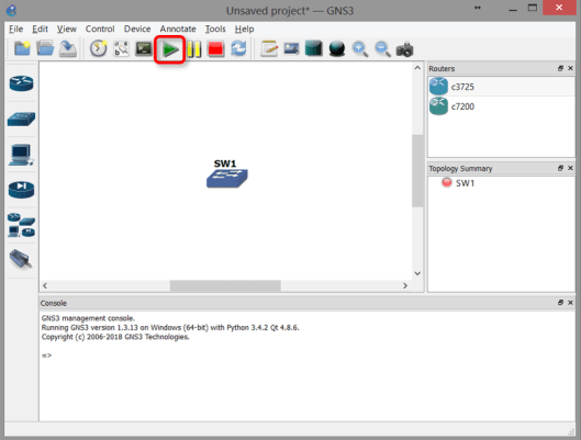 - Above your topology, click the green Start arrow to boot up the device. You’ll notice that the red dot next to the switch in your Topology Summary turns green once the device has started.