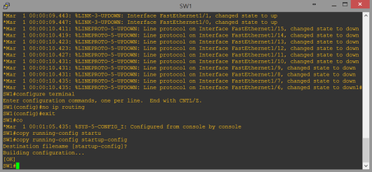 - From here, disable IP routing by first moving into global configuration mode with the configure terminal command. Then disable IP routing by entering no ip routing.